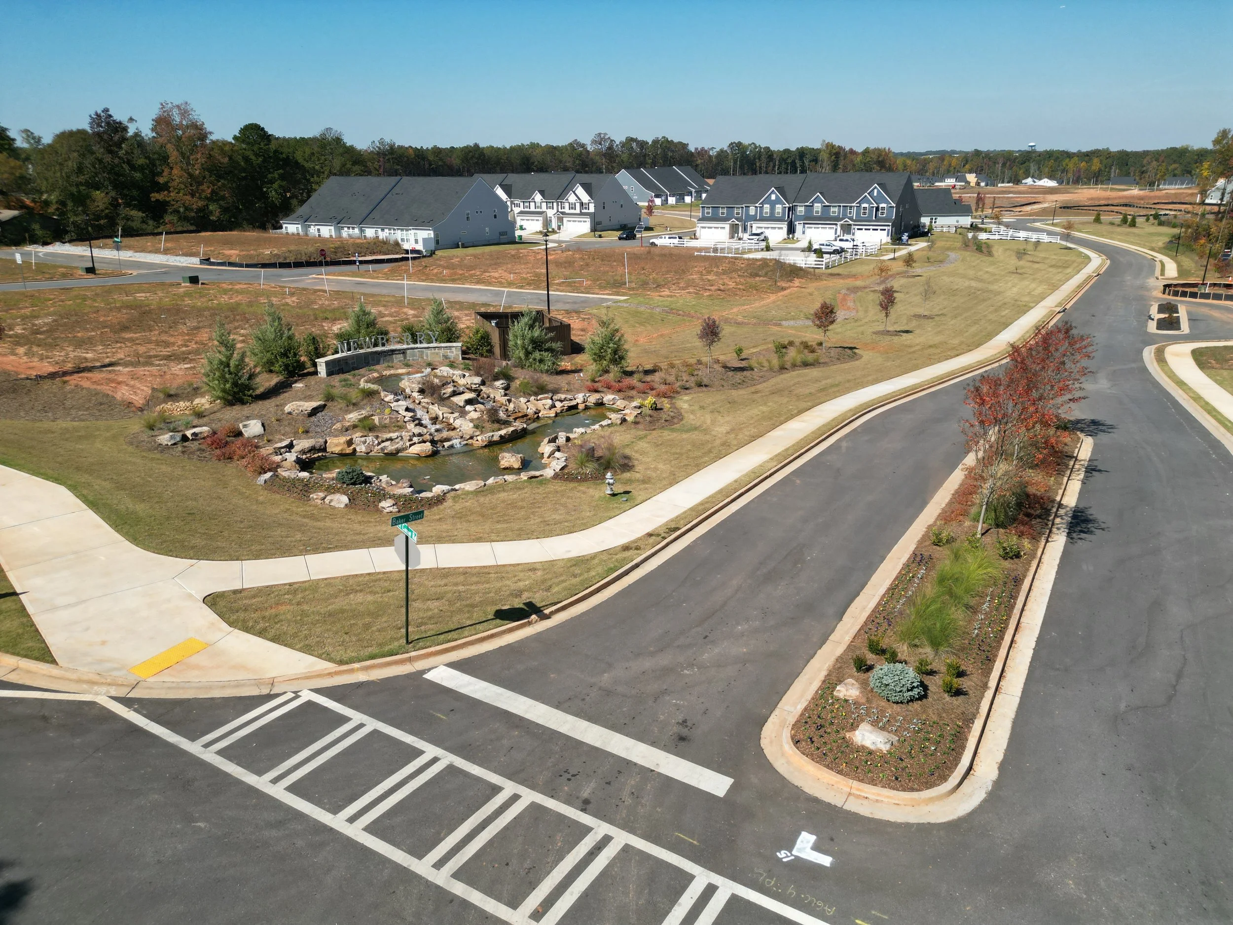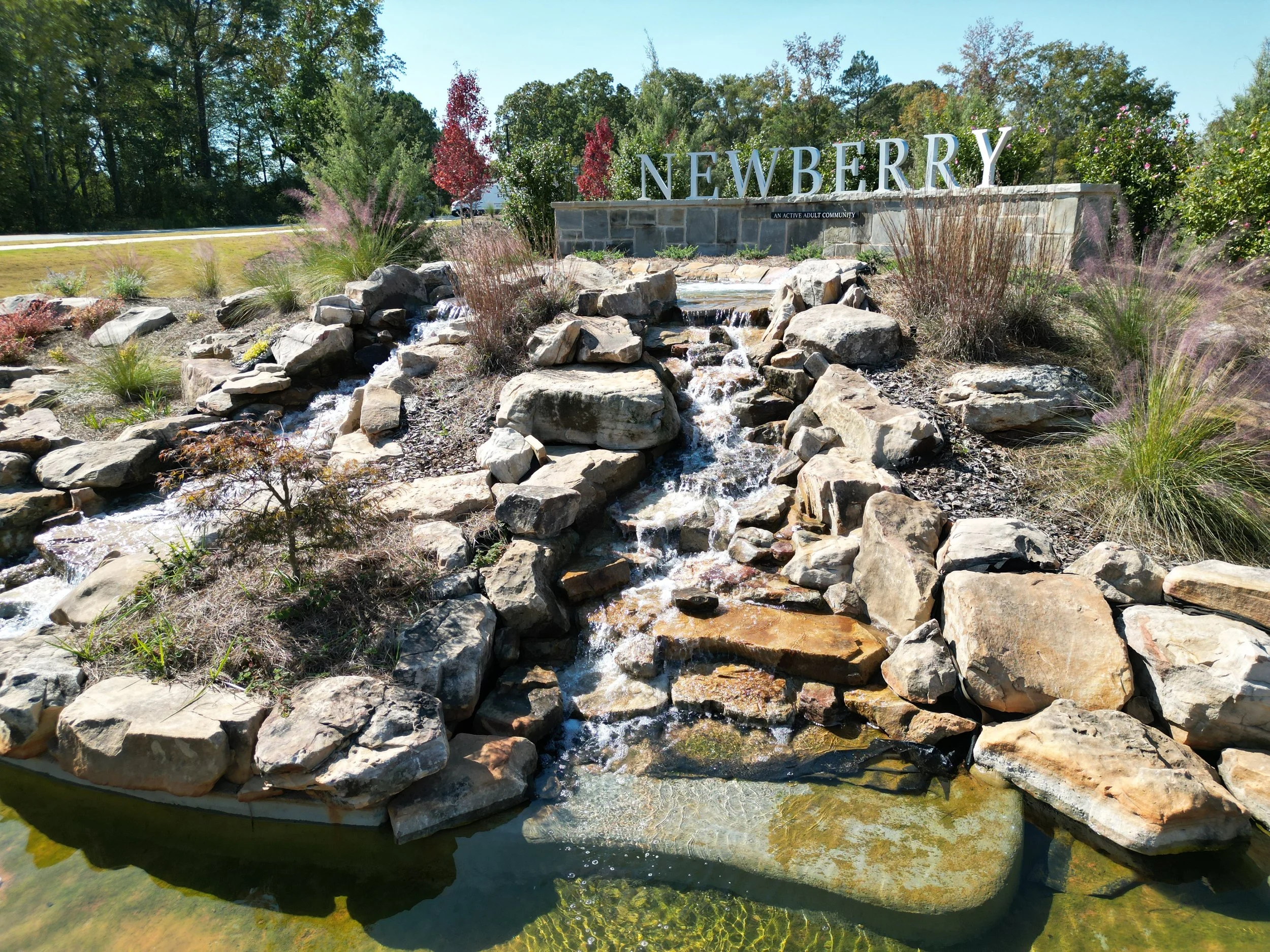At Newberry, an active adult community, New Life Landscaping created a striking first impression with the installation of a stunning water feature and pond at the grand entrance. This elegant focal point sets the tone for the peaceful, well-designed surroundings within the community.